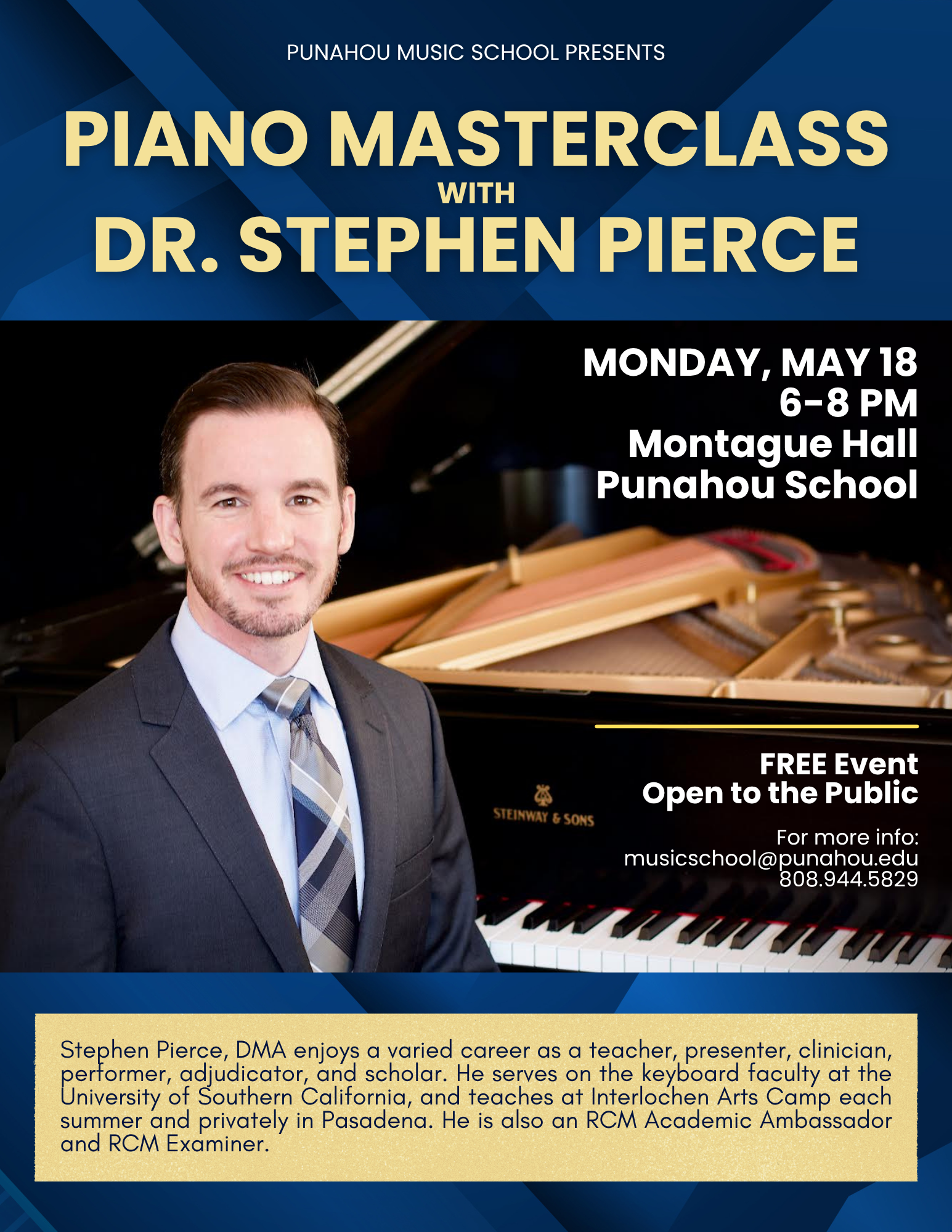 The Royal Conservatory of Music examiner, Dr. Stephen Pierce will present a Masterclass on Monday, May 18, from 6-8 p.m. at Montague Hall at Punahou School.